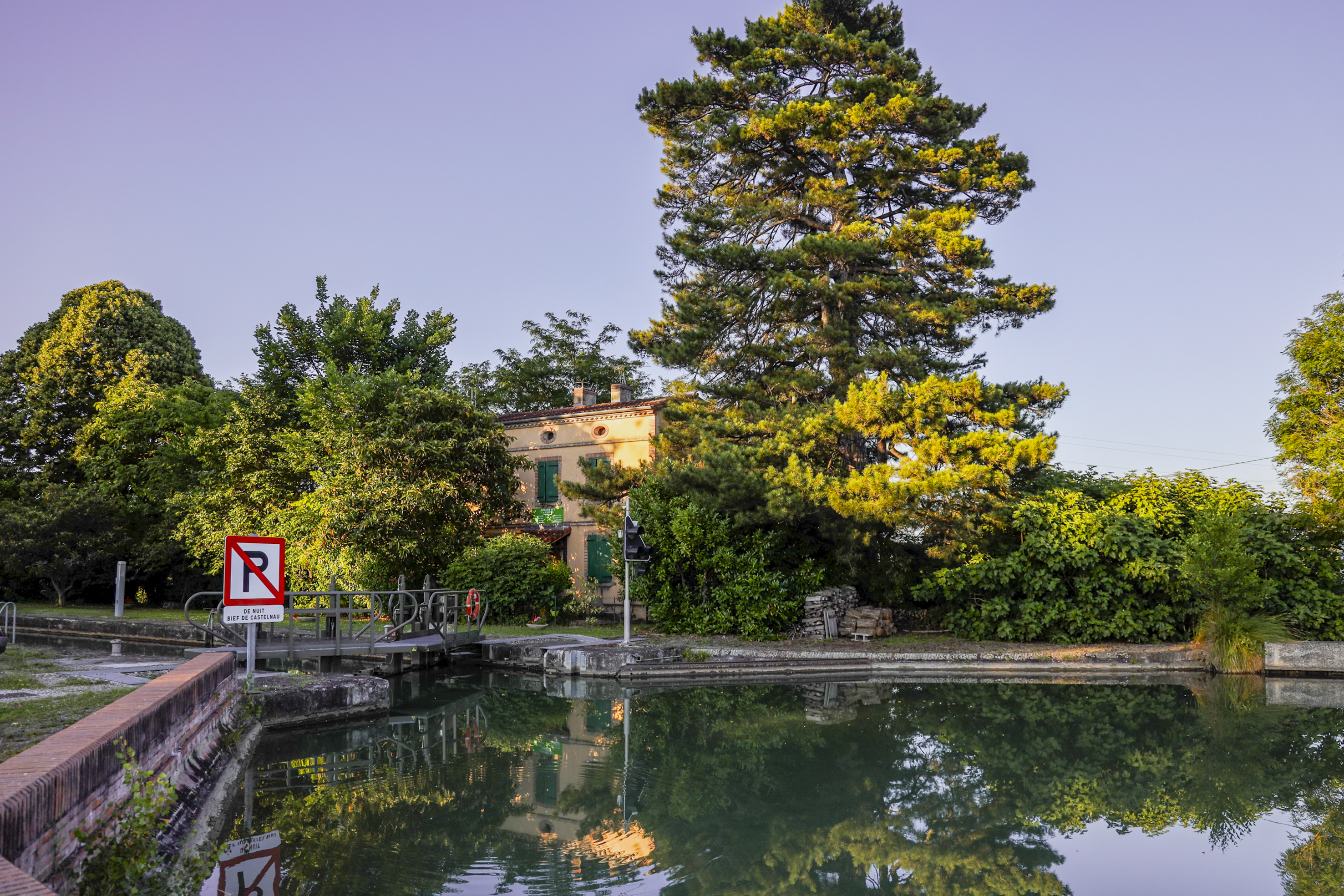 Ecluse simple accolée à un pont-canal située sur le Canal Latéral à la Garonne. Construites vers 1840, les écluses du Canal de Garonne ou Canal Latéral se distinguent par leurs parois latérales (ou bajoyers) parfaitement parallèles, contrairement aux écluses du Canal du Midi qui sont de forme ovale.