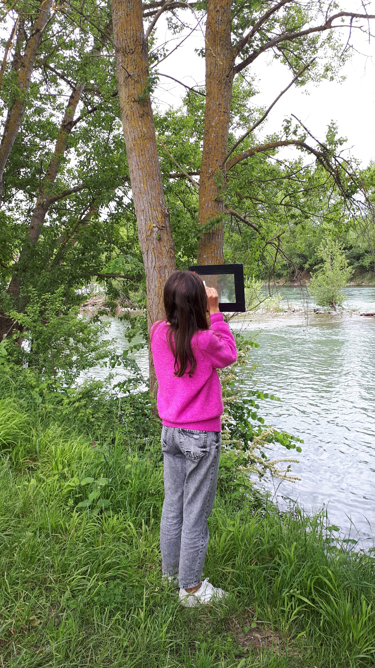 Matériel fourni : viseur spécifique permettant d'aplanir le paysage, feutre welleda, chiffon. Papier A4, crayon.