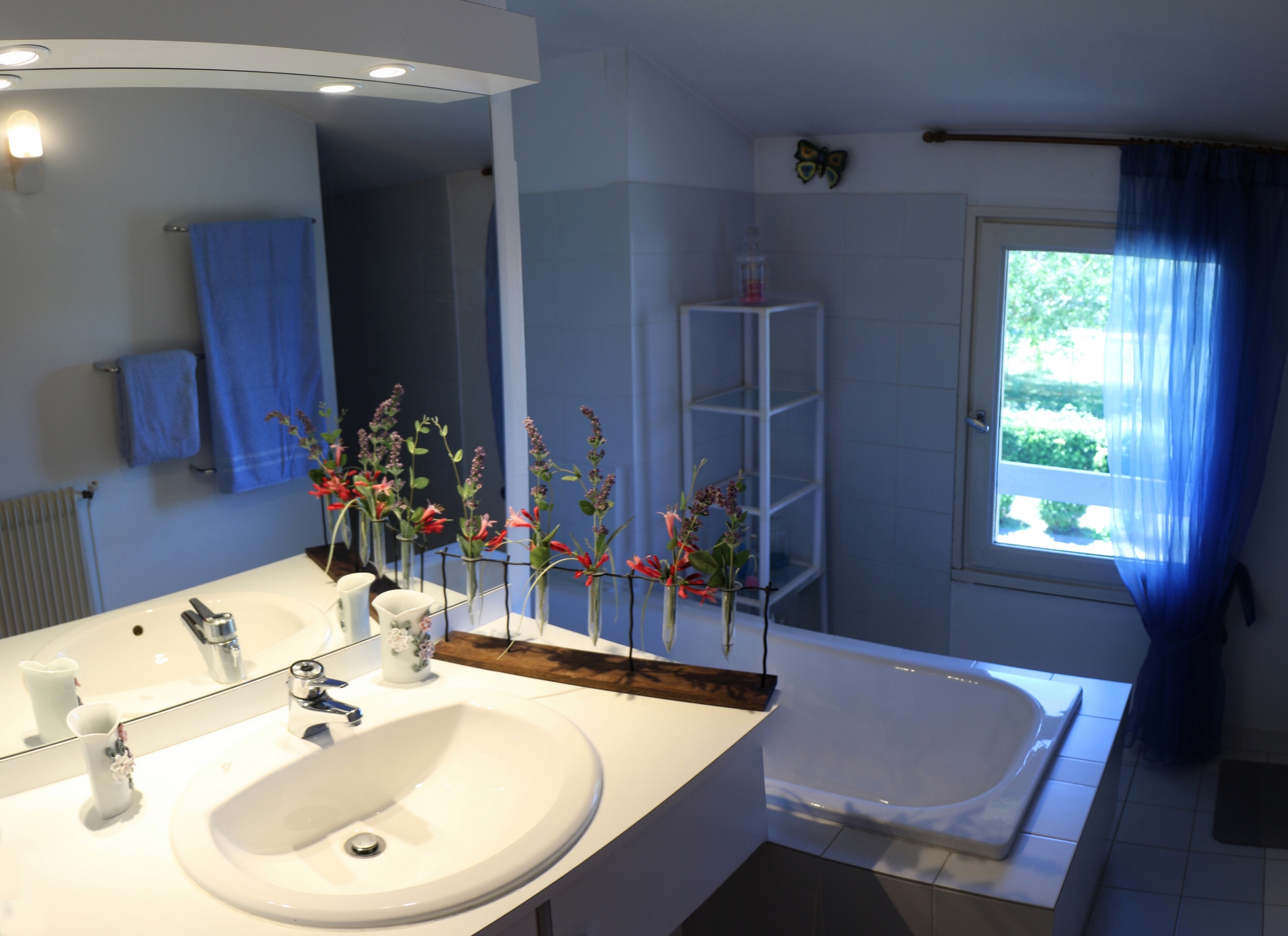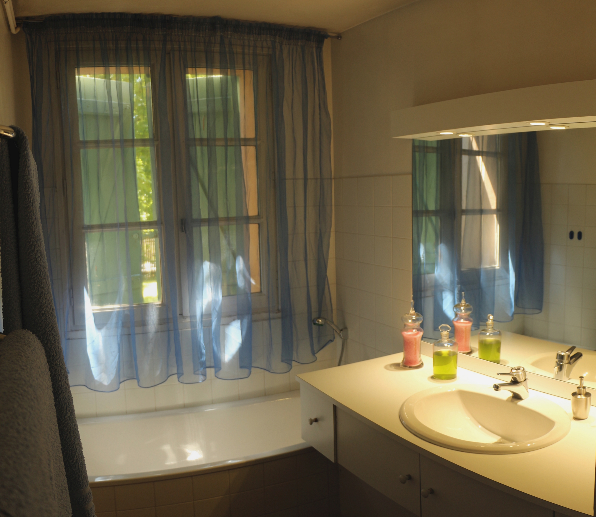 La chambre "Côté Jardin" possède une salle de bain (avec une large vasque, une douche et une baignoire) et un dressing « en suite » ; le WC privé est situé juste à côté. La chambre de 12 m2 dispose d'un couchage en 140 cm, d'une imposante armoire ancienne et d'un placard penderie.