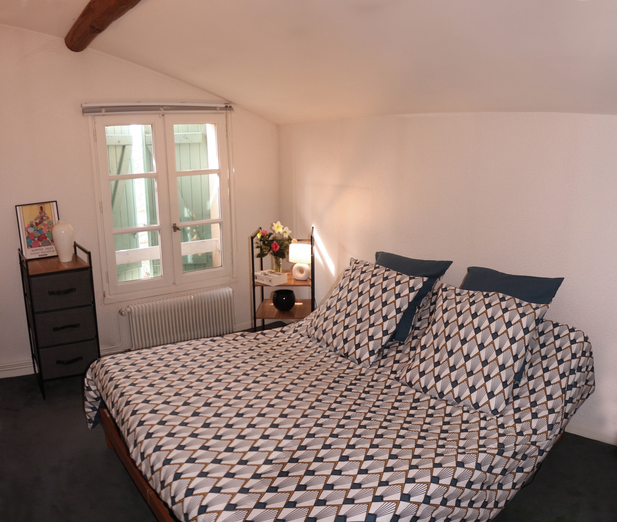 La chambre « Côté Couchant » (10 m2) possède un lit de relaxation double (2 x 80 x 200). Elle peut offrir une alternative à la chambre « Côté Levant » ou bien constituer un complément pour l’hébergement de deux adultes supplémentaires.