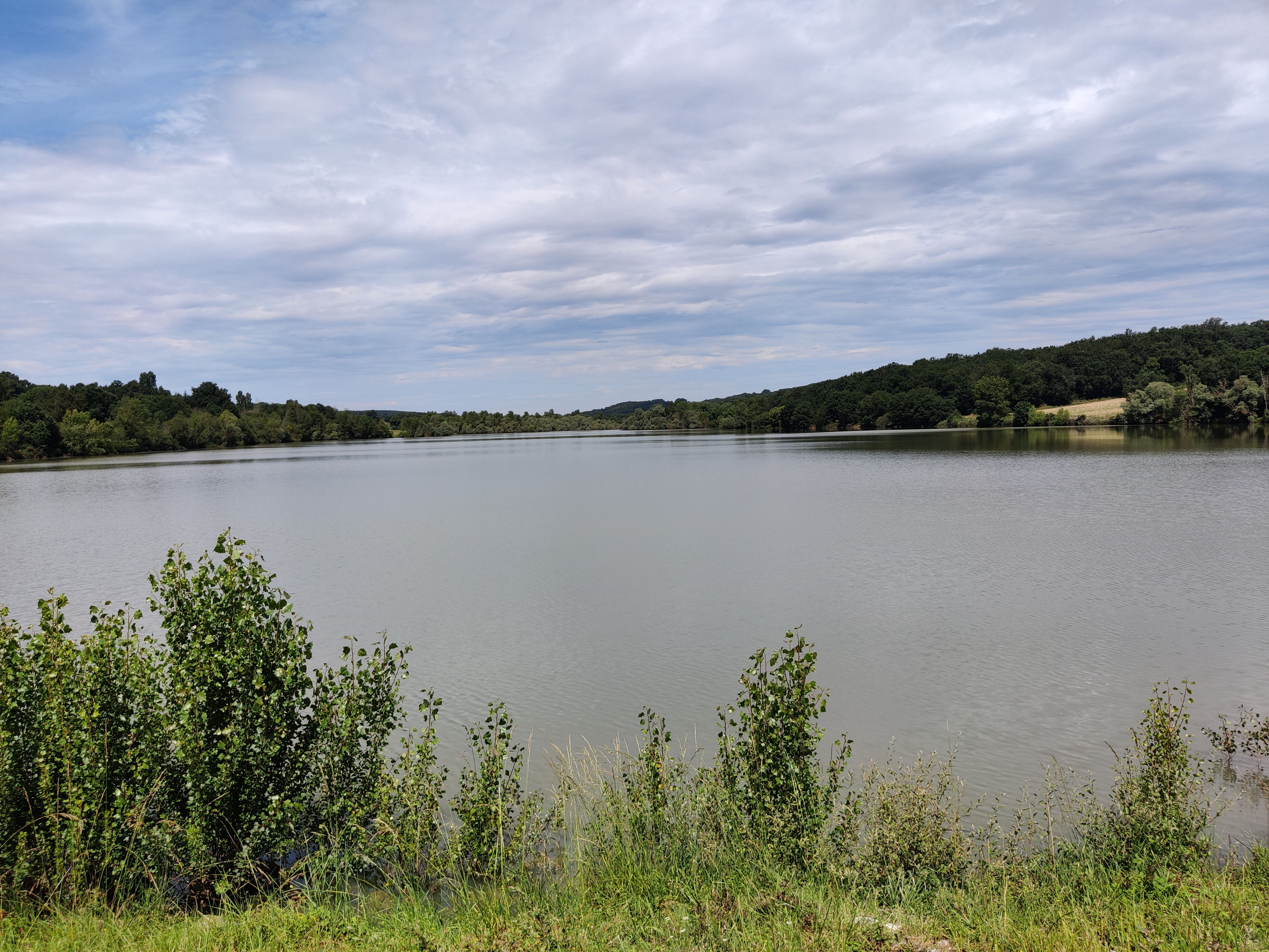 Arriver à la route, tourner à gauche, marcher environ 500m, puis dans le tournant au bas d'une petite montée, emprunter le chemin à gauche qui surplombe le lac jusqu'à la digue. Laisser la digue sur la gauche et poursuivre sur le chemin goudronné jusqu'à la route D53b.